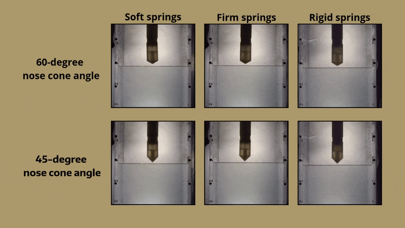 The team designed prototypes consisting of a head and body segment connected with springs of varying stiffness. By dropping these “divers” from varying heights, they could alter the spring’s stiffness and also swap out the head to test the effects of different head shapes.